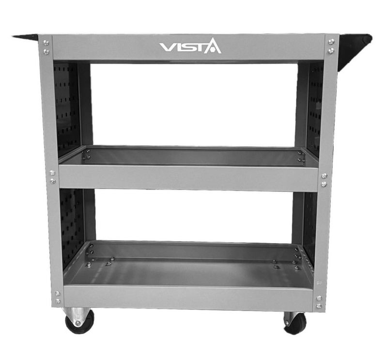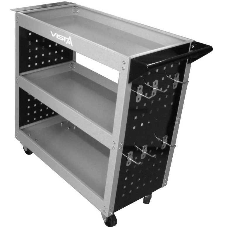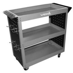 Carrinho móvel VISTA para ferramentas equipado com 3 prateleiras e laterais perfuradas equipadas com 12 ganchos.